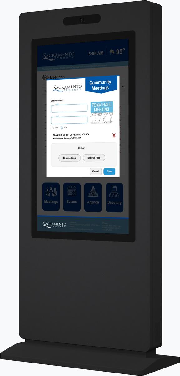 CivicAgenda is a purpose-built digital agenda display solution designed for municipalities and public agencies. It replaces outdated paper agenda boards with secure, always-on digital signage that makes meeting agendas and public notices clearly visible, easy to update, and accessible to everyone. Built for City Halls, council chambers, and public service buildings, CivicAgenda helps local governments improve transparency, reduce administrative overhead, and modernize how public information is shared—without adding complexity for staff.
