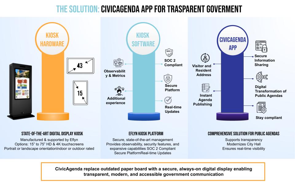 CivicAgenda runs on the Eflyn Kiosk Platform, a secure, enterprise-grade system for managing devices, content, and updates at scale. The platform provides centralized control, real-time publishing, remote monitoring, system health visibility, and robust security features—enabling municipalities to manage displays confidently with minimal IT overhead.