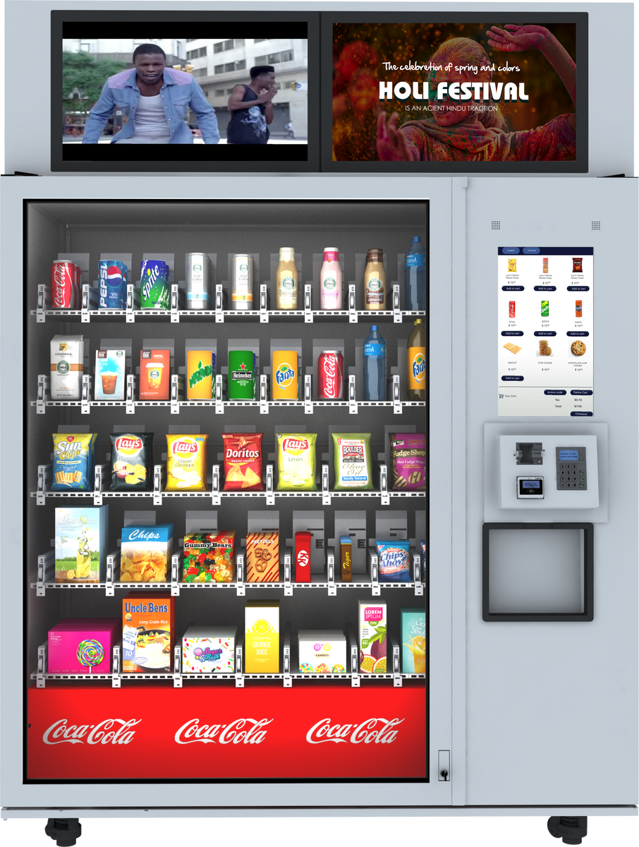 The machine's display showcases high-resolution images and detailed product information, helping customers make informed purchase decisions. It can also display promotional offers, nutritional facts, and allergen information.