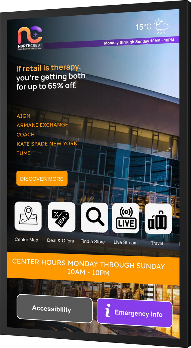 Showcase promotions, directories, and interactive brand messaging with maximum visibility, without taking up valuable floor space.